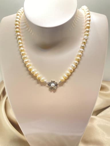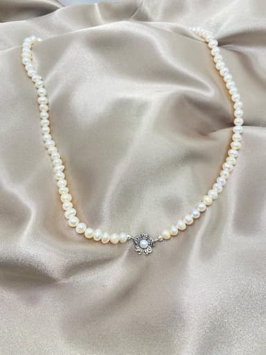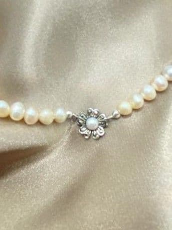 Colar em Pérolas barrocas 4mm c/ centro1. 44+ext.4cm. Centro flor c/ 1/2 pérola ao centro 0,4 e pétalas cravadas c/ marcassite