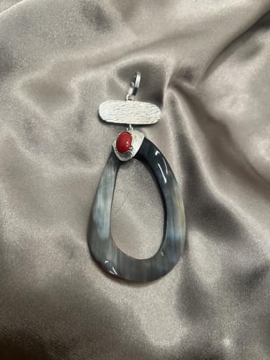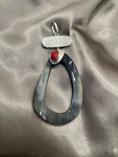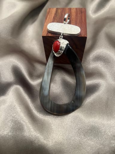 Pendente c/ Peça Oval em Prata c/ Coral Sintético Cravado e Peça em Chifre