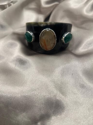 Pulseira Larga a Expedir em Chifre c/ Topos em Prata, c/ Quartzo Rutilado Cabochão ao Centro e 1 Ágata Cabochão Verde de cada Lado