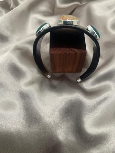 Pulseira em Chifre e Prata, c/ Quartzo Centro e 1 Ágata Cabochão Verde